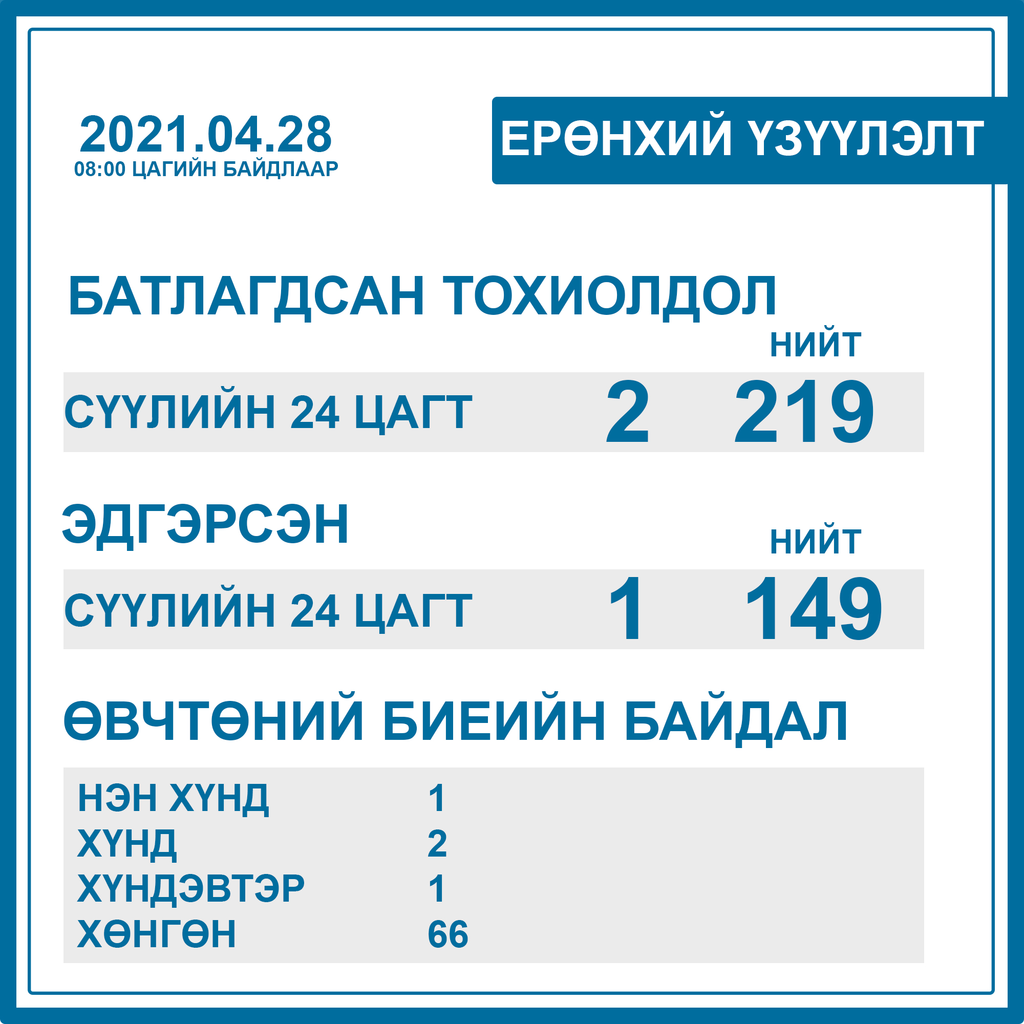 Бүсийн оношилгоо эмчилгээний төвийн Вируслогийн салбар лаборатори 2021 оны 04 дүгээр сарын 27-ны 8:00 цагаас 04 дүгээр сарын 28-ны 08:00 цаг буюу сүүлийн 24 цагийн хугацаанд нийт 210 сорьцод PCR шинжилгээ хийжээ. Энэ хугацаанд халдварын батлагдсан тохиолдол 2-оор нэмэгдэж өнөөдрийн /2021.04.28/ байдлаар 219 боллоо.
