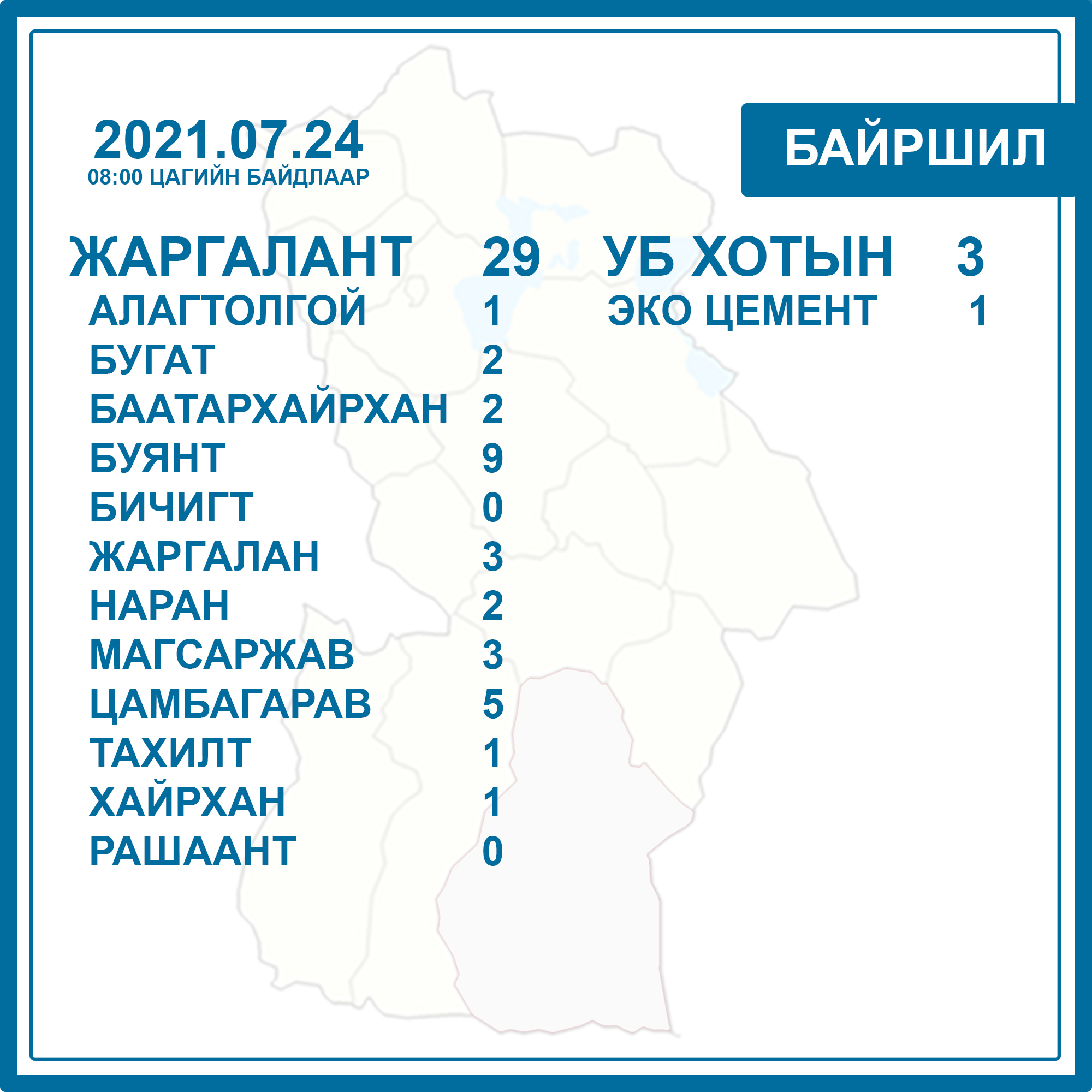 2021 оны 07 дугаар сарын 23-ны 8:00 цагаас 07 дугаар сарын 24-ний 08:00 цаг буюу сүүлийн 24 цагийн хугацаанд нийт 181 сорьцод PCR шинжилгээ хийжээ. Коронавируст халдварын батлагдсан тохиолдол 33-аар нэмэгдэж нийт 2074 боллоо.