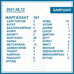 2021 оны 08 дугаар сарын 11-ний 8:00 цагаас 08 дугаар сарын 12-ны 08:00 цаг буюу сүүлийн 24 цагийн хугацаанд нийт 513 сорьцод PCR шинжилгээ хийжээ. Коронавируст халдварын батлагдсан тохиолдол 138-аар нэмэгдэж нийт 3323 боллоо.
