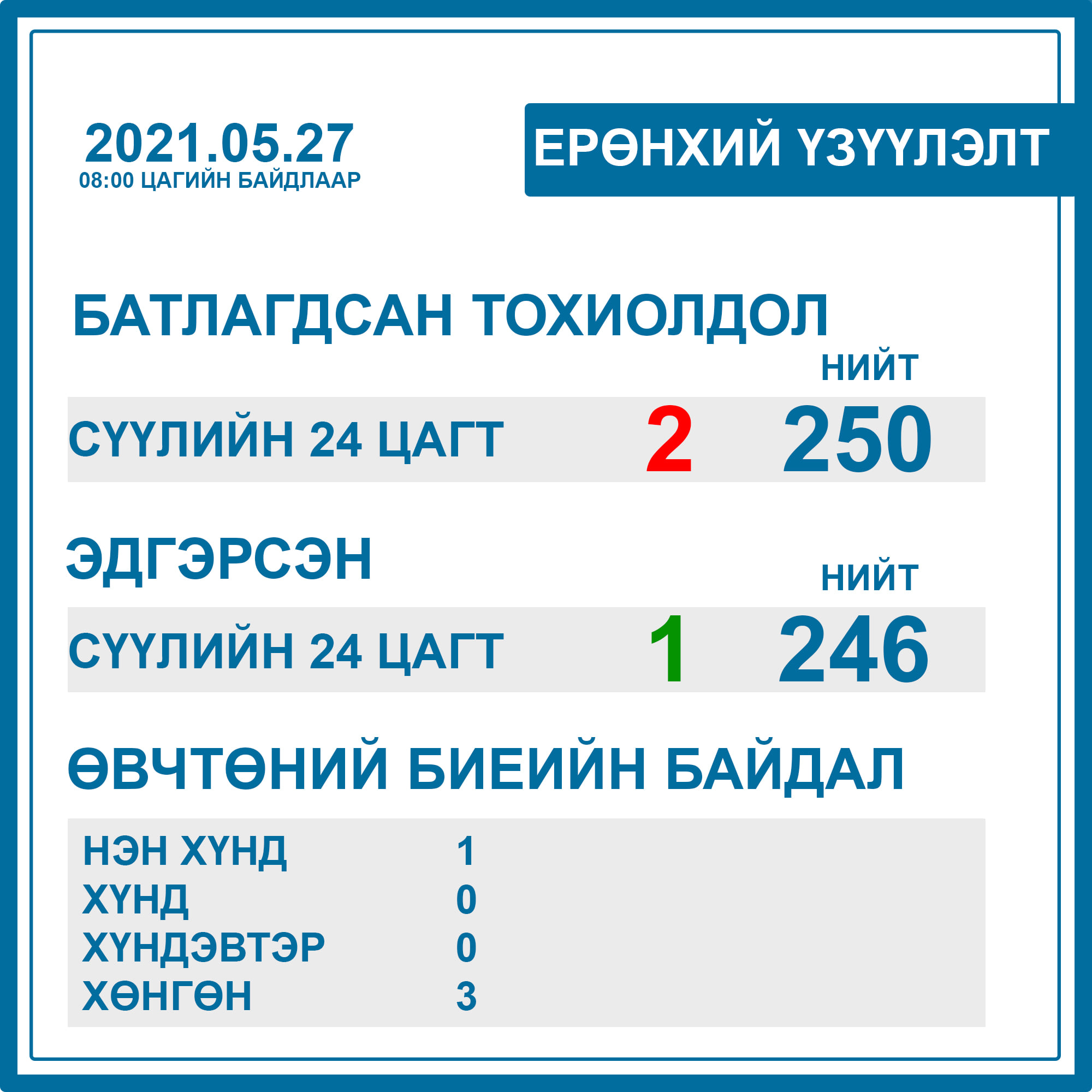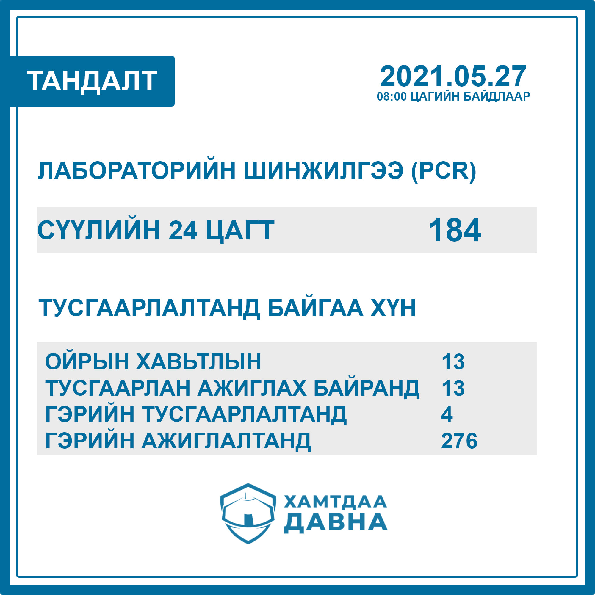 2021 оны 05 дугаар сарын 26-ны 8:00 цагаас 05 дугаар сарын 27-ны 08:00 цаг буюу сүүлийн 24 цагийн хугацаанд нийт 184 сорьцод PCR шинжилгээ хийжээ. Үүний 92 сорьцод Бүсийн оношилгоо эмчилгээний төвийн Вируслогийн салбар лаборатори, 92 сорьцод ЗӨСТ-ийн явуулын баг шинжилгээ хийсэн байна. "Ковид-19"-ийн халдварын тохиолдол 2-оор нэмэгдэж нийт 250 боллоо.