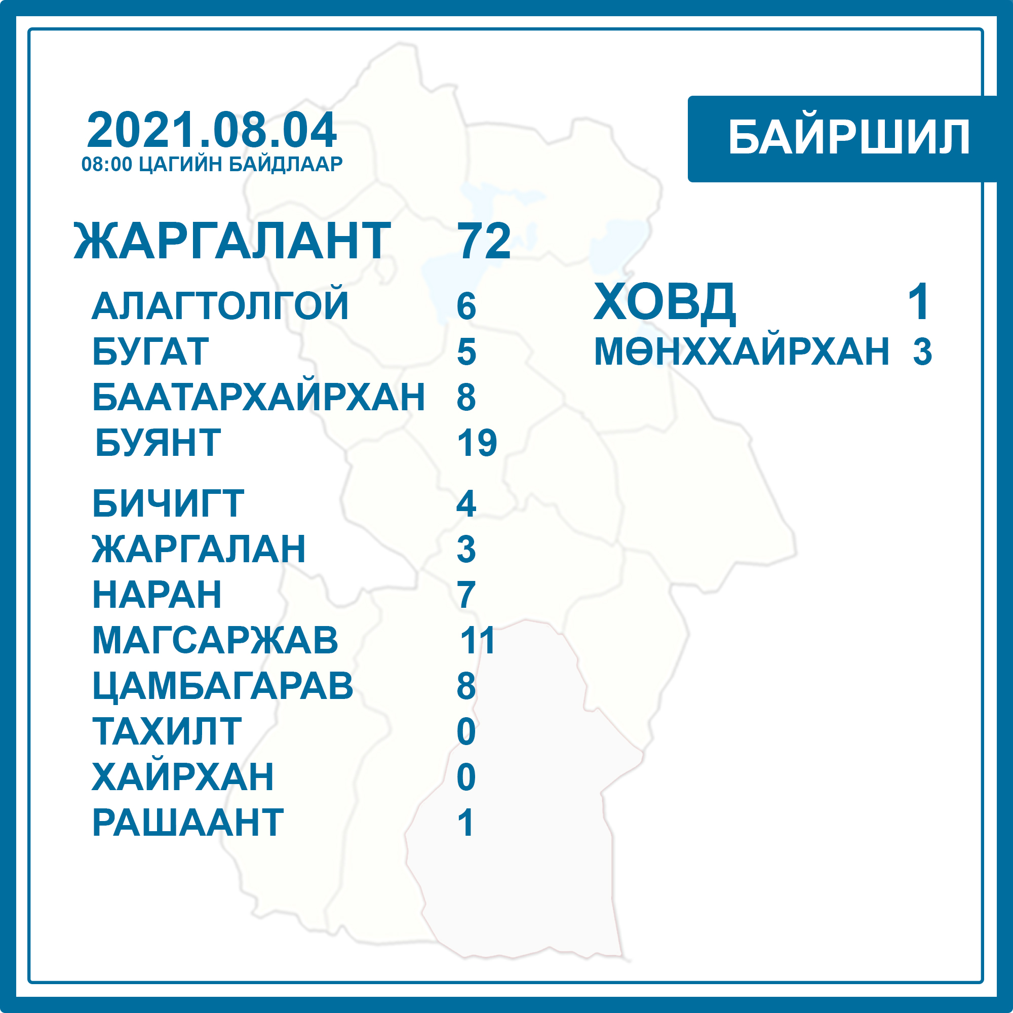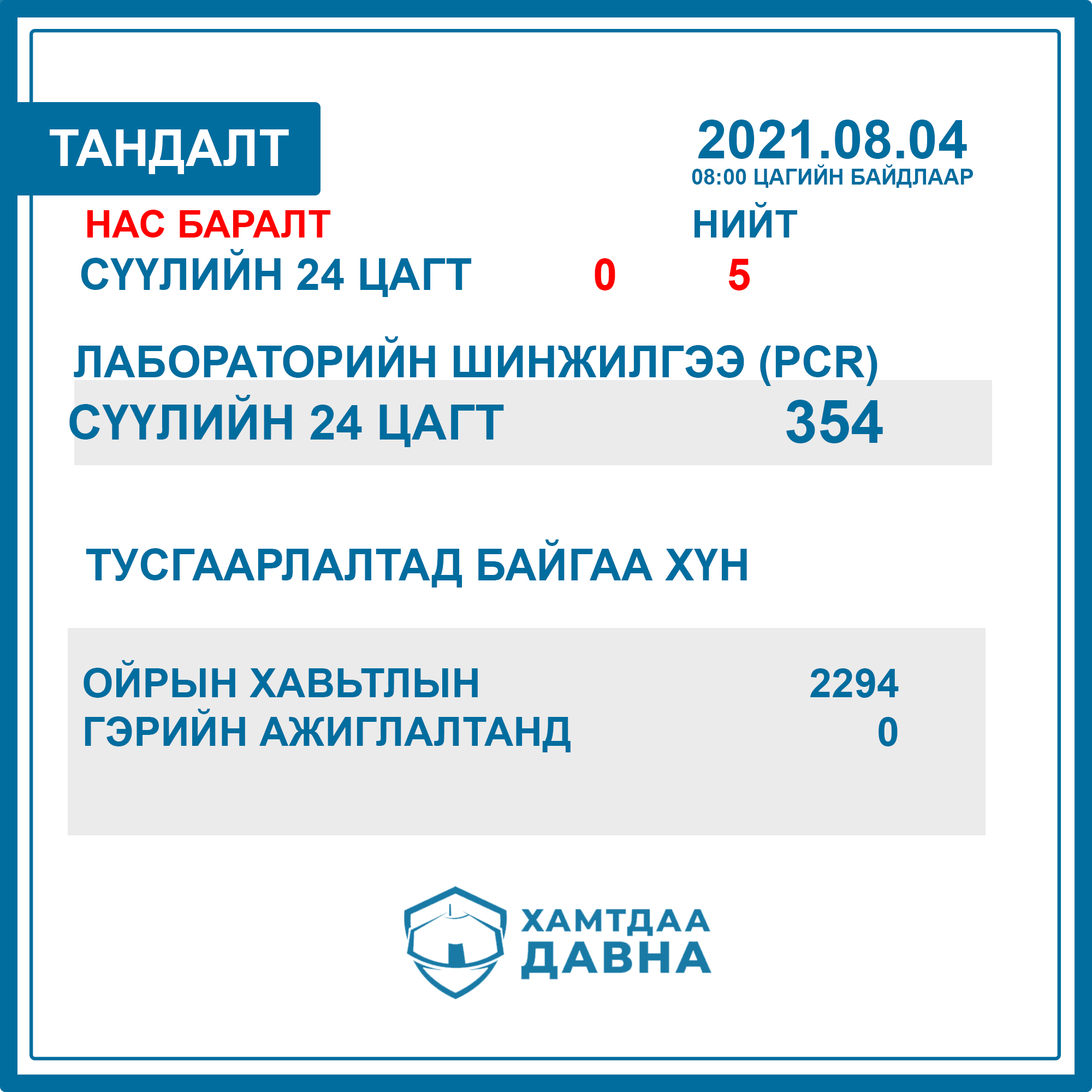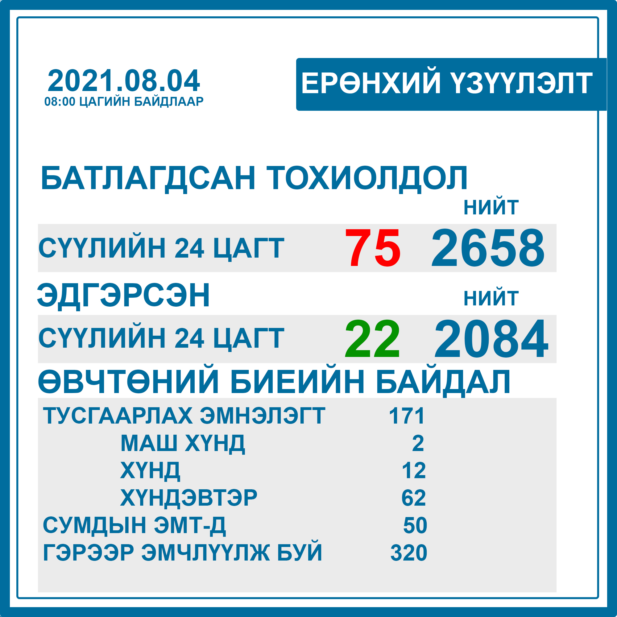 2021 оны 08 дугаар сарын 03-ны 8:00 цагаас 08 дугаар сарын 04-ний 08:00 цаг буюу сүүлийн 24 цагийн хугацаанд нийт 354 сорьцод PCR шинжилгээ хийжээ. Коронавируст халдварын батлагдсан тохиолдол 75-аар нэмэгдэж нийт 2658 боллоо.