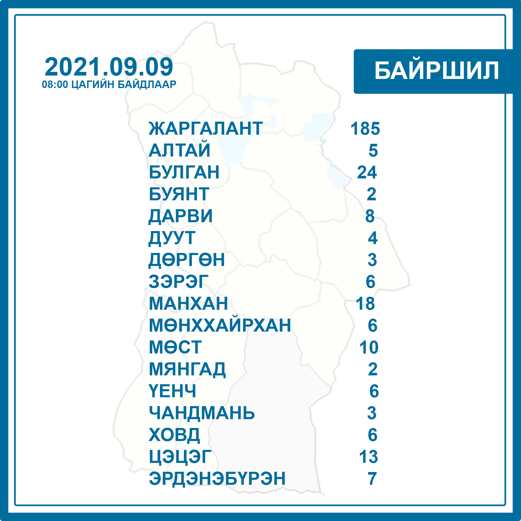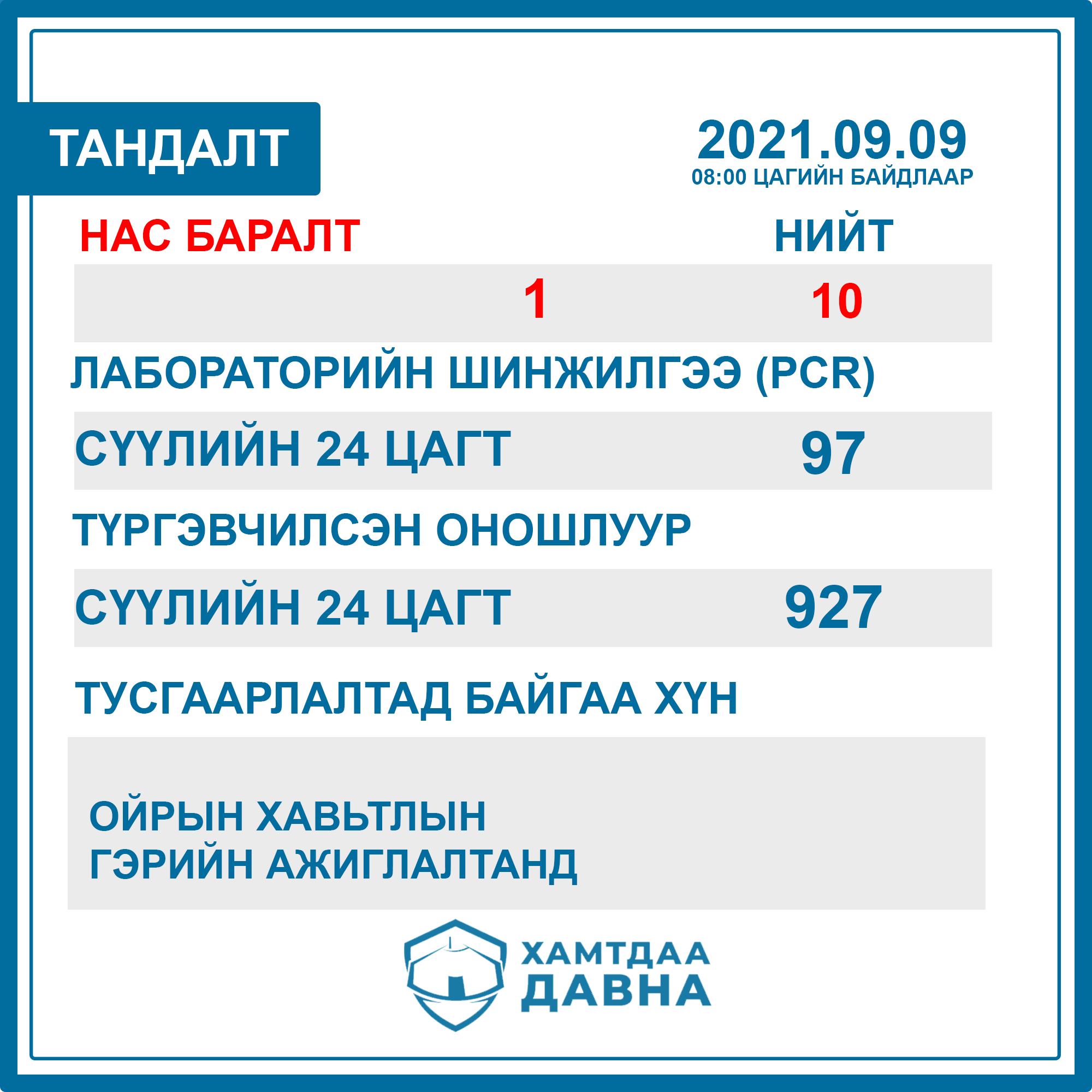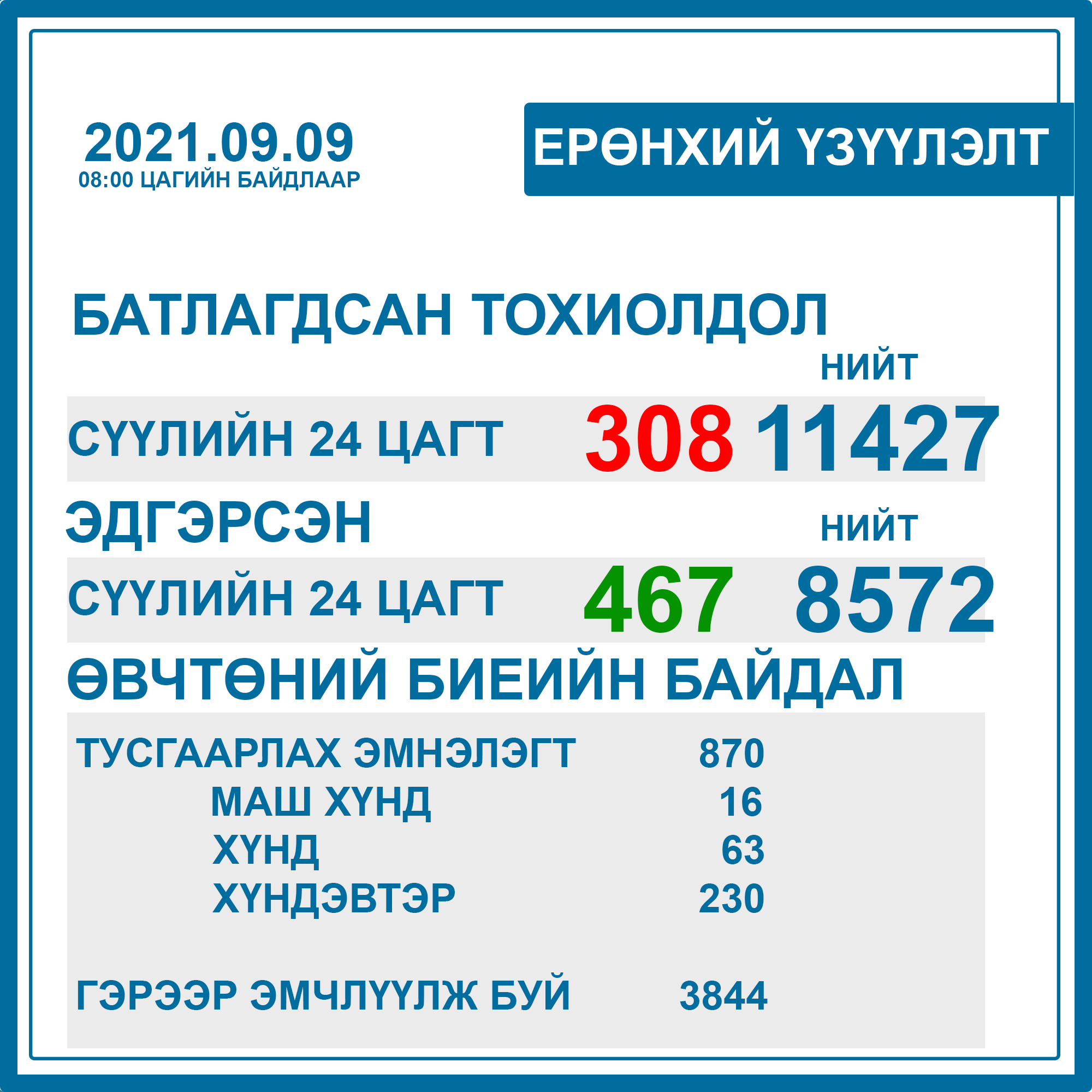 2021 оны 09 дугаар сарын 08-ны 08:00 цагаас 09 дүгээр сарын 09-ны 08:00 цаг буюу сүүлийн 24 цагийн хугацаанд нийт 927 сорьцод түргэвчилсэн оношлуураар шинжилгээ хийхэд 299 эерэг, 97 сорьцод PCR шинжилгээ хийхэд 9 эерэг гарчээ. Коронавируст халдварын батлагдсан тохиолдол 308-аар нэмэгдэж нийт 11427 боллоо.