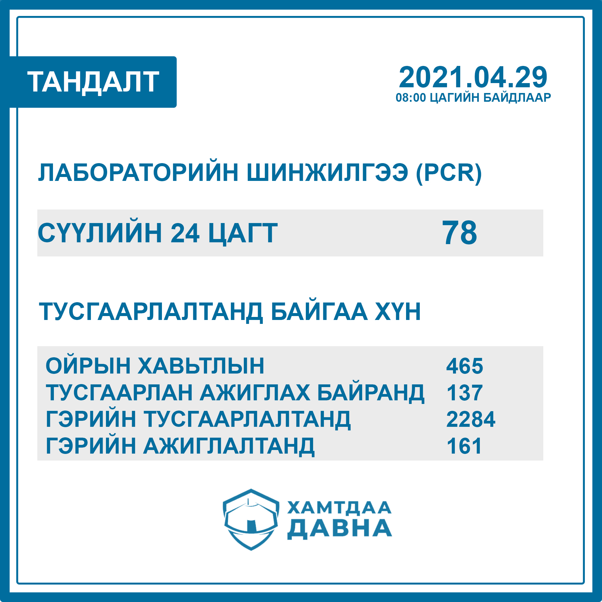 Бүсийн оношилгоо эмчилгээний төвийн Вируслогийн салбар лаборатори 2021 оны 04 дүгээр сарын 28-ны 8:00 цагаас 04 дүгээр сарын 29-ны 08:00 цаг буюу сүүлийн 24 цагийн хугацаанд нийт 78 сорьцод PCR шинжилгээ хийжээ. Энэ хугацаанд халдварын батлагдсан тохиолдол 3-аар нэмэгдэж өнөөдрийн /2021.04.29/ байдлаар 222 боллоо.