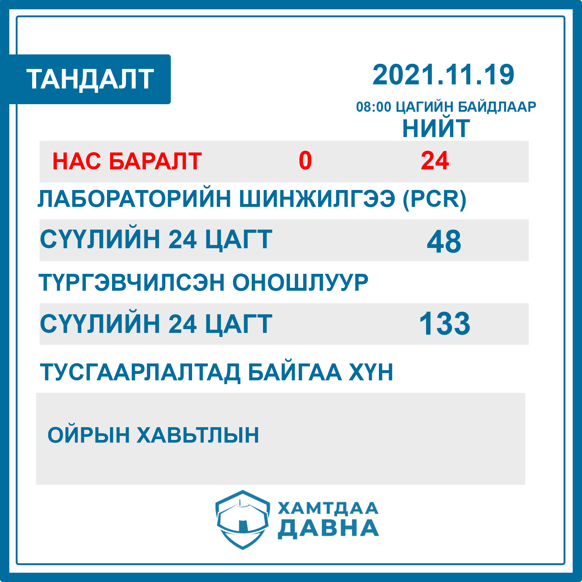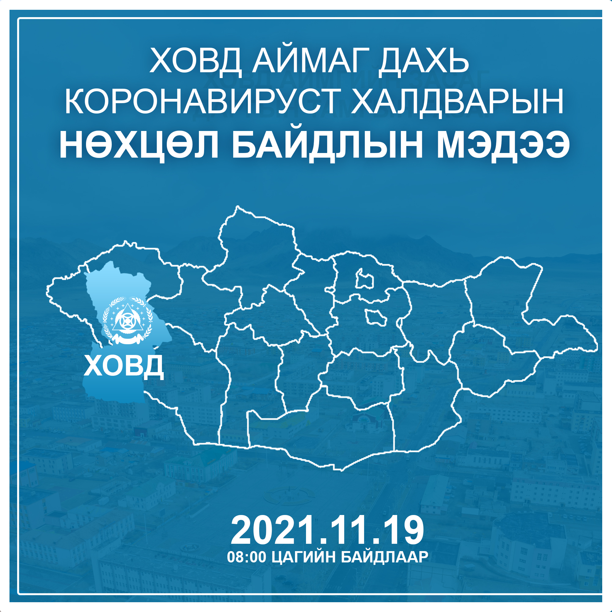 2021 оны 11 дүгээр сарын 18-ны 08:00 цагаас 11 дүгээр сарын 19-ний 08:00 цаг буюу сүүлийн 24 цагийн хугацаанд нийт 133 сорьцод түргэвчилсэн оношлуураар шинжилгээ хийхэд 17 эерэг, 48 сорьцод PCR шинжилгээ хийхэд 10 эерэг гарчээ . Коронавируст халдварын батлагдсан тохиолдол 27-оор нэмэгдэж нийт 19262 боллоо.