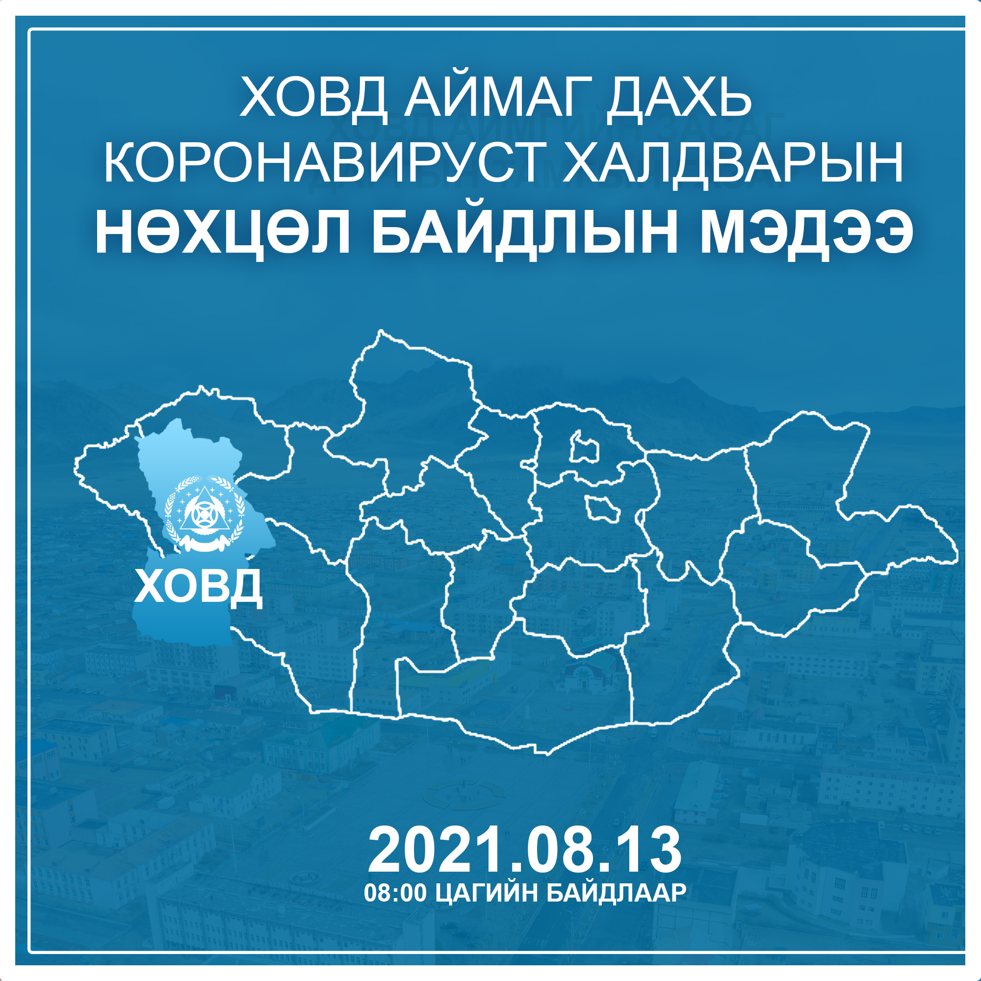 Аймгийн Онцгой комиссын дэргэдэх “Шуурхай штаб”-аас өгсөн мэдээллээр Ховд их сургуулийн болон Халдвартын тасгийн “Тусгаарлах эмнэлэг”-т өнөөдрийн /2021.08.13/ байдлаар 209 хүн хэвтэн эмчлүүлж байгаагийн 39 нь 0-18 насны хүүхэд, 13 нь жирэмсэн эх байна. Тэдгээрээс маш хүнд-2, хүнд-15, хүндэвтэр-91 бусад нь хөнгөн.
