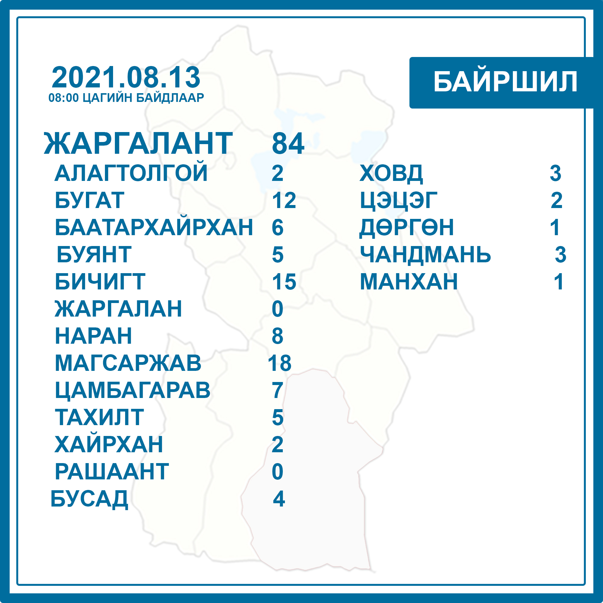 2021 оны 08 дугаар сарын 12-ны 8:00 цагаас 08 дугаар сарын 13-ны 08:00 цаг буюу сүүлийн 24 цагийн хугацаанд нийт 335 сорьцод PCR шинжилгээ хийжээ. Коронавируст халдварын батлагдсан тохиолдол 94-өөр нэмэгдэж нийт 3417 боллоо.