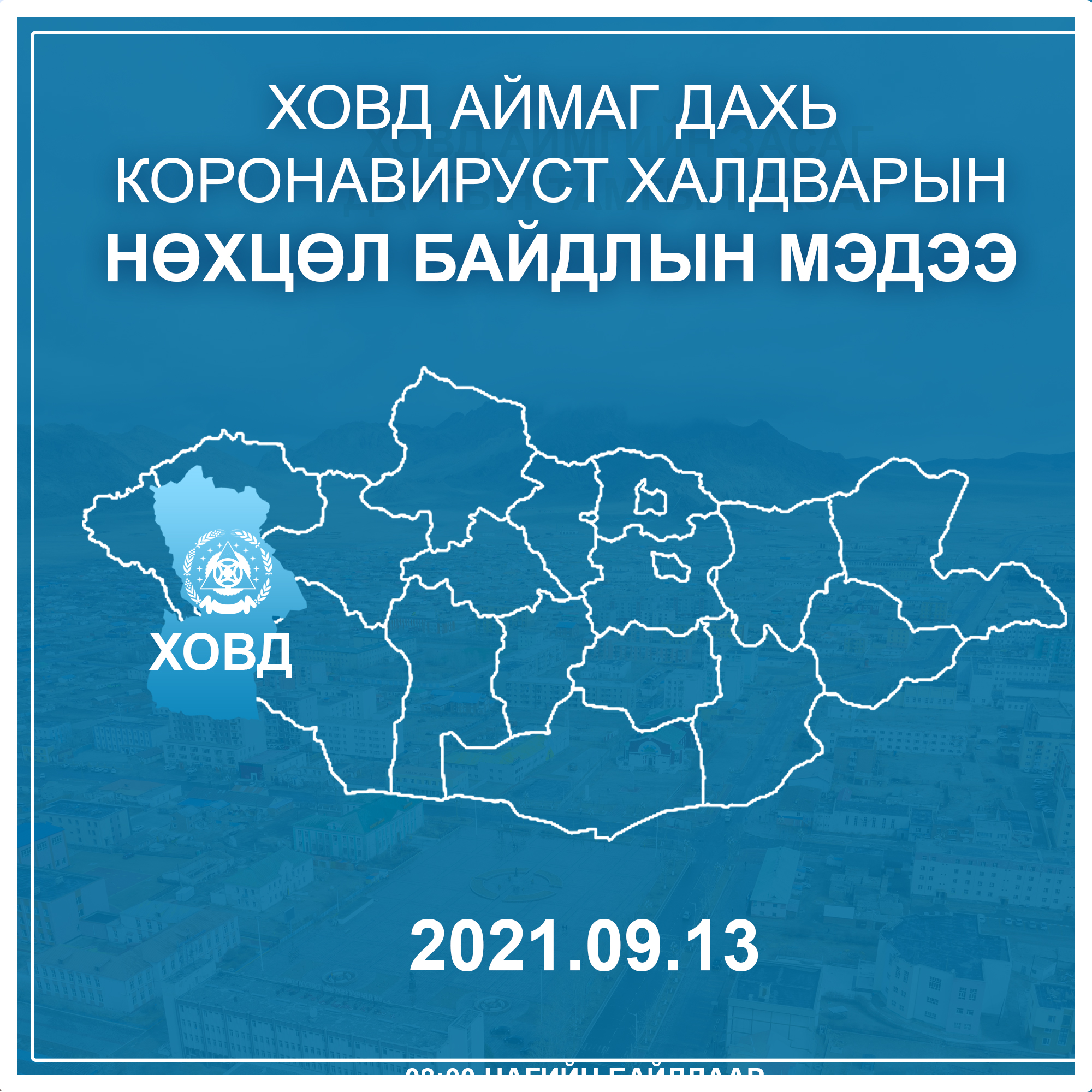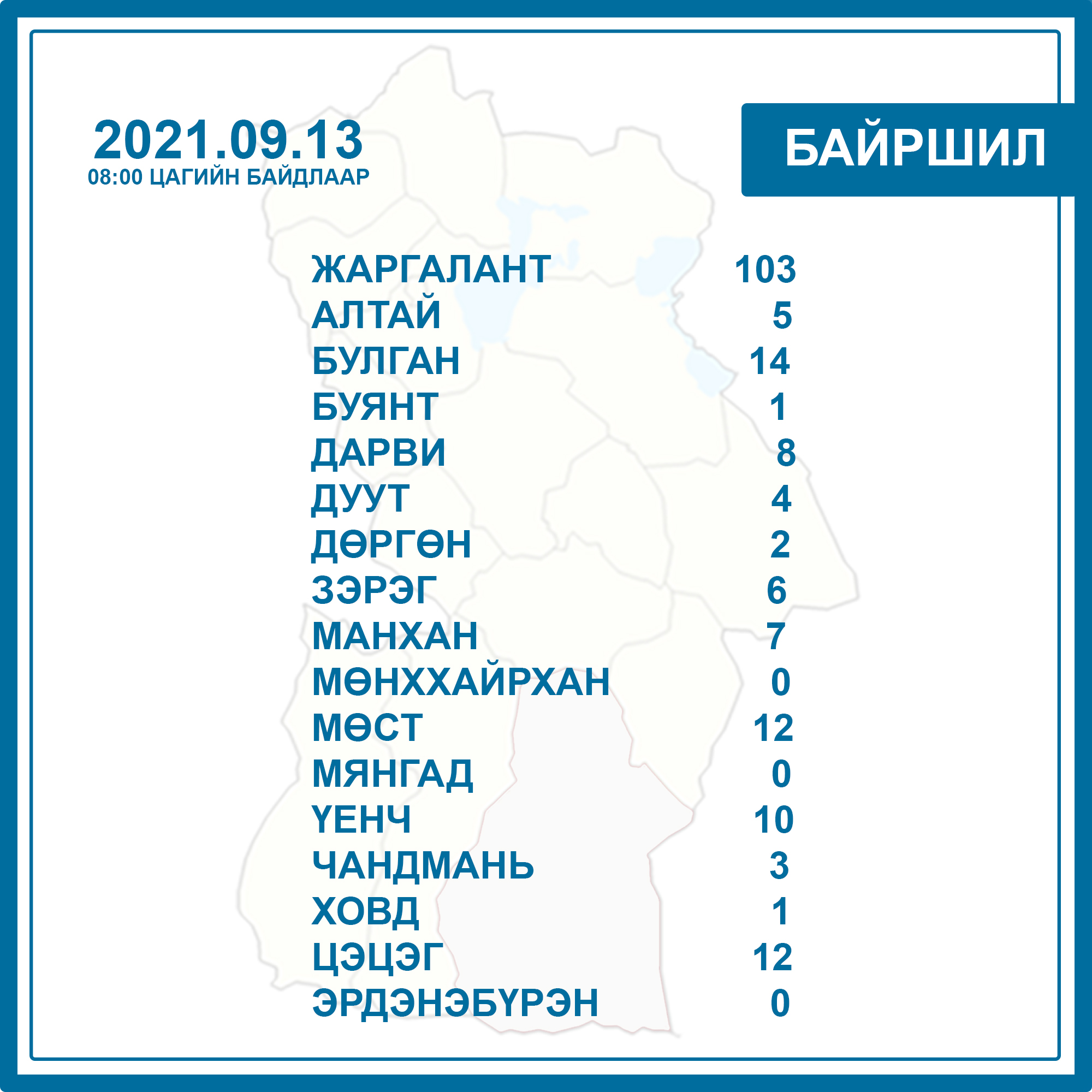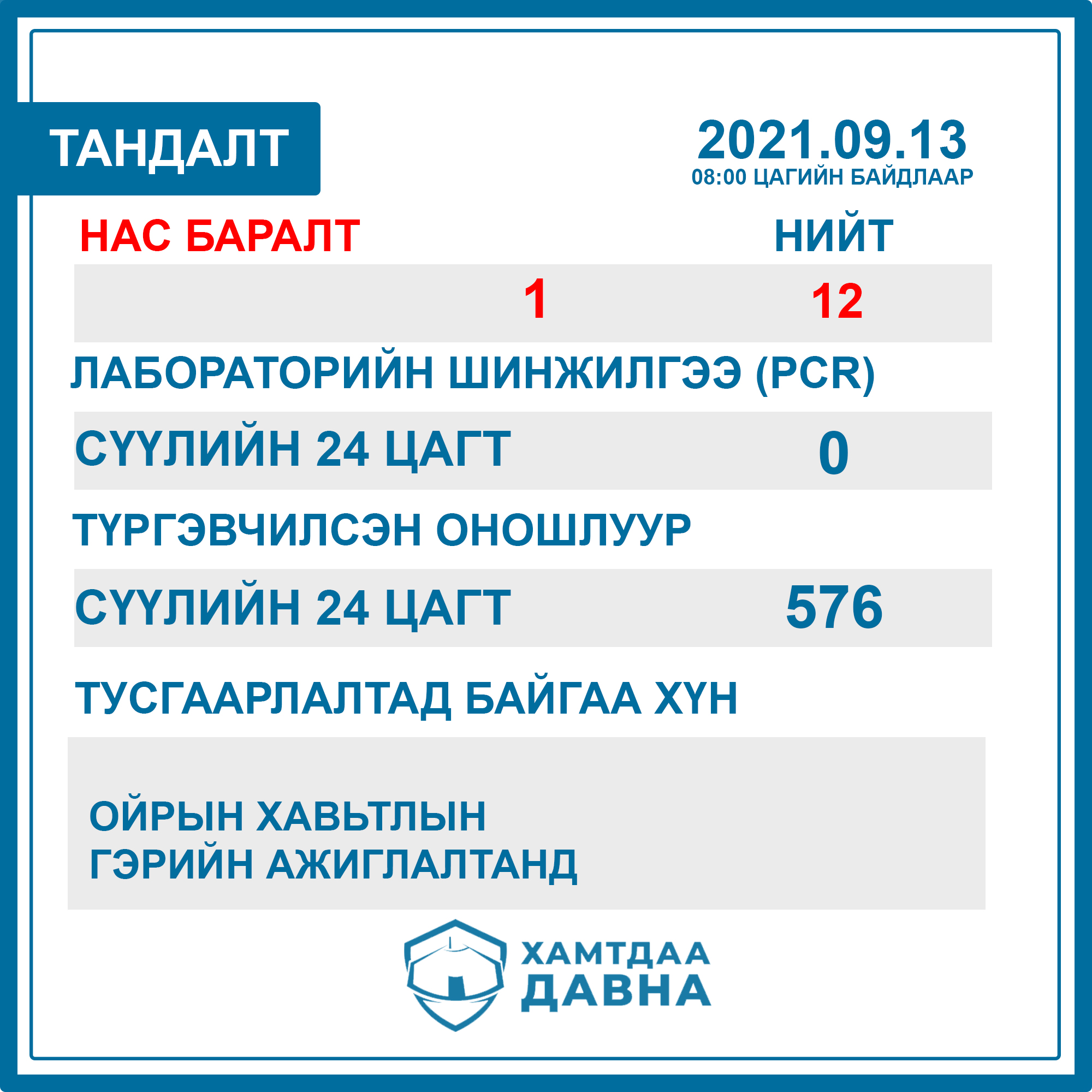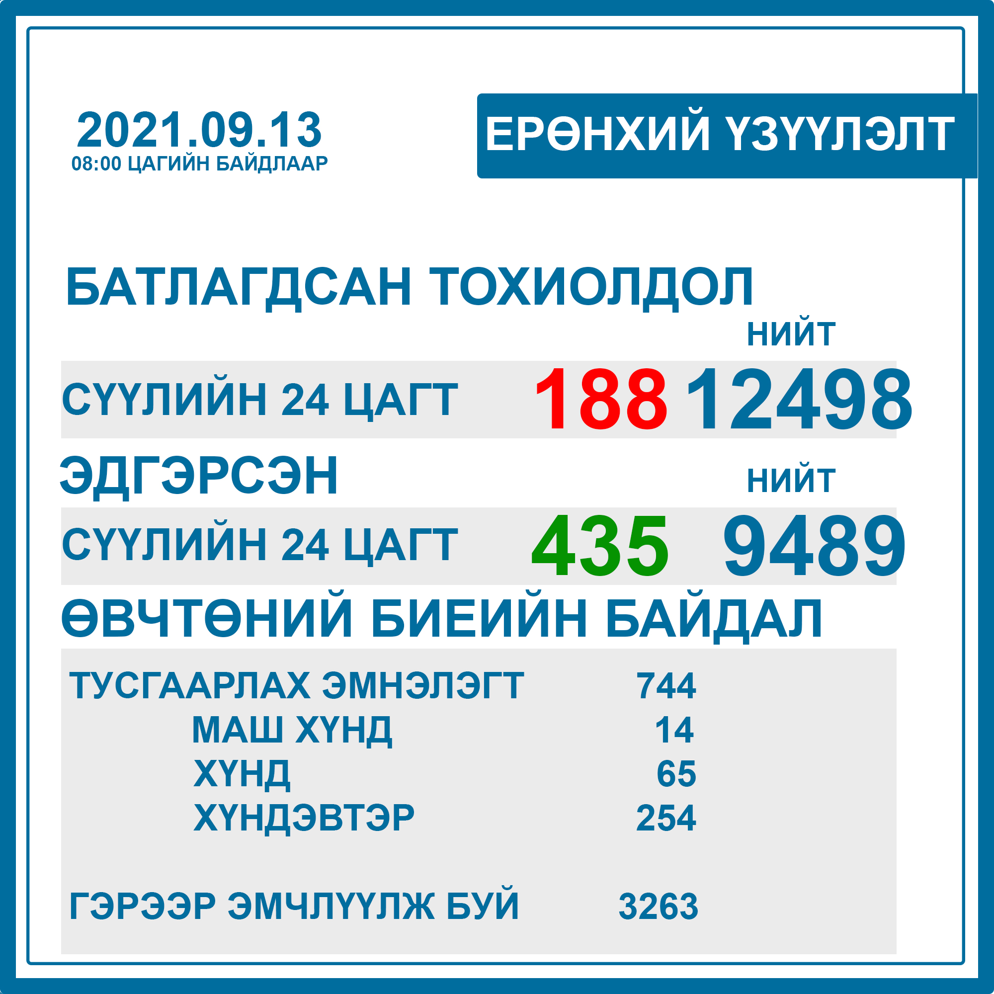 2021 оны 09 дугаар сарын 12-ны 08:00 цагаас 09 дүгээр сарын 13-ны 08:00 цаг буюу сүүлийн 24 цагийн хугацаанд нийт 576 сорьцод түргэвчилсэн оношлуураар шинжилгээ хийхэд 188 эерэг гарчээ. Коронавируст халдварын батлагдсан тохиолдол 188-аар нэмэгдэж нийт 12498 боллоо.