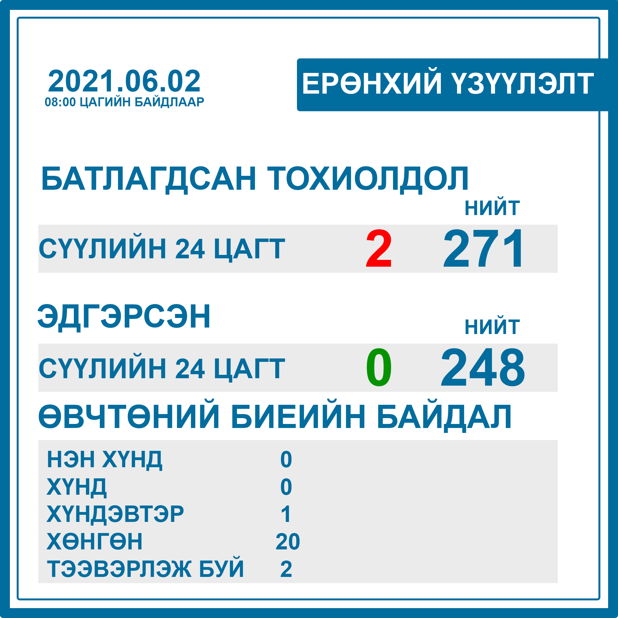 Халдварын батлагдсан тохиолдол 2-оор нэмэгдэж нийт 271 боллоо. Үүний 248 нь эдгэрч эмнэлгээс гарчээ.