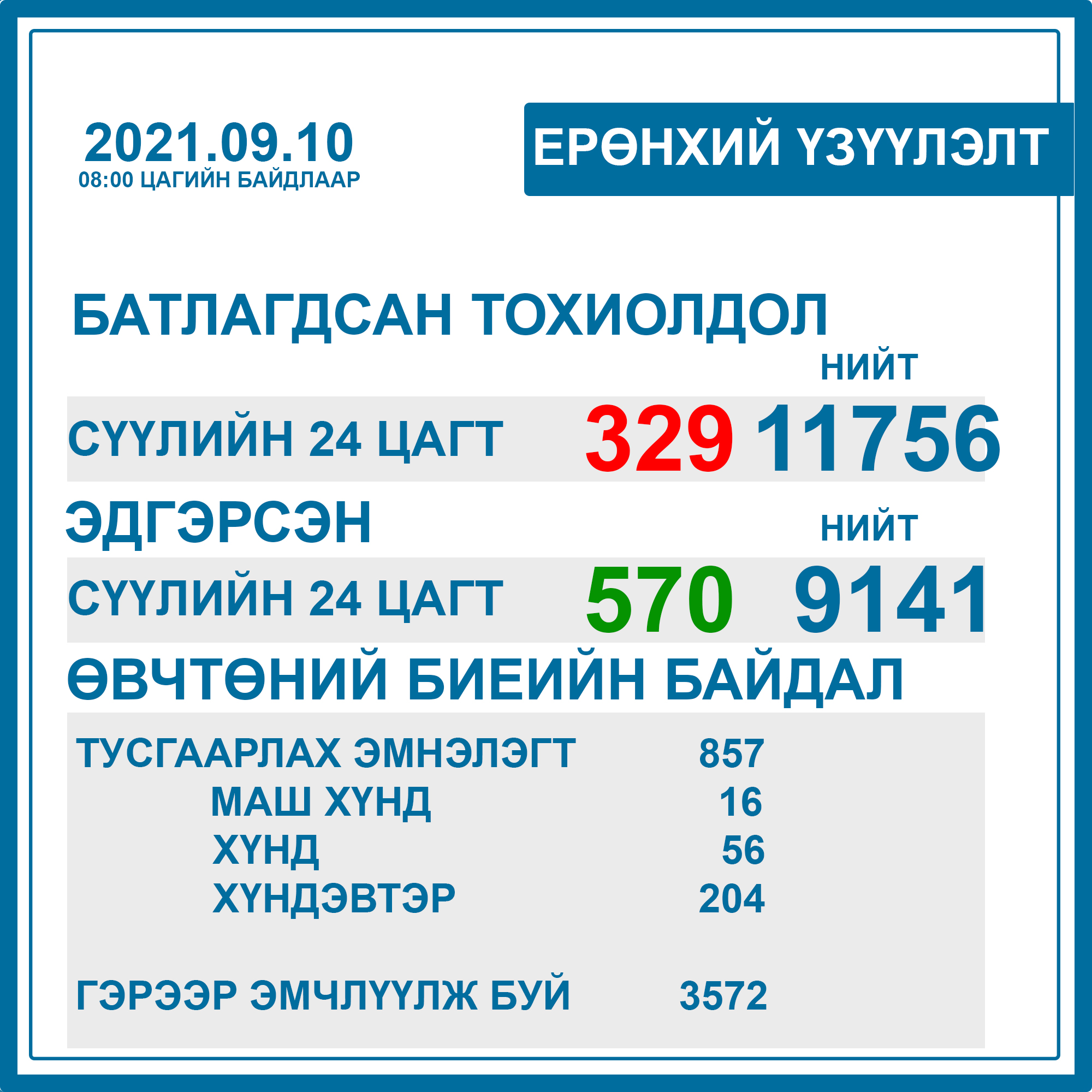 2021 оны 09 дугаар сарын 09-ний 08:00 цагаас 09 дүгээр сарын 10-ны 08:00 цаг буюу сүүлийн 24 цагийн хугацаанд нийт 843 сорьцод түргэвчилсэн оношлуураар шинжилгээ хийхэд 316 эерэг, 96 сорьцод PCR шинжилгээ хийхэд 13 эерэг гарчээ. Коронавируст халдварын батлагдсан тохиолдол 329-өөр нэмэгдэж нийт 11756 боллоо.