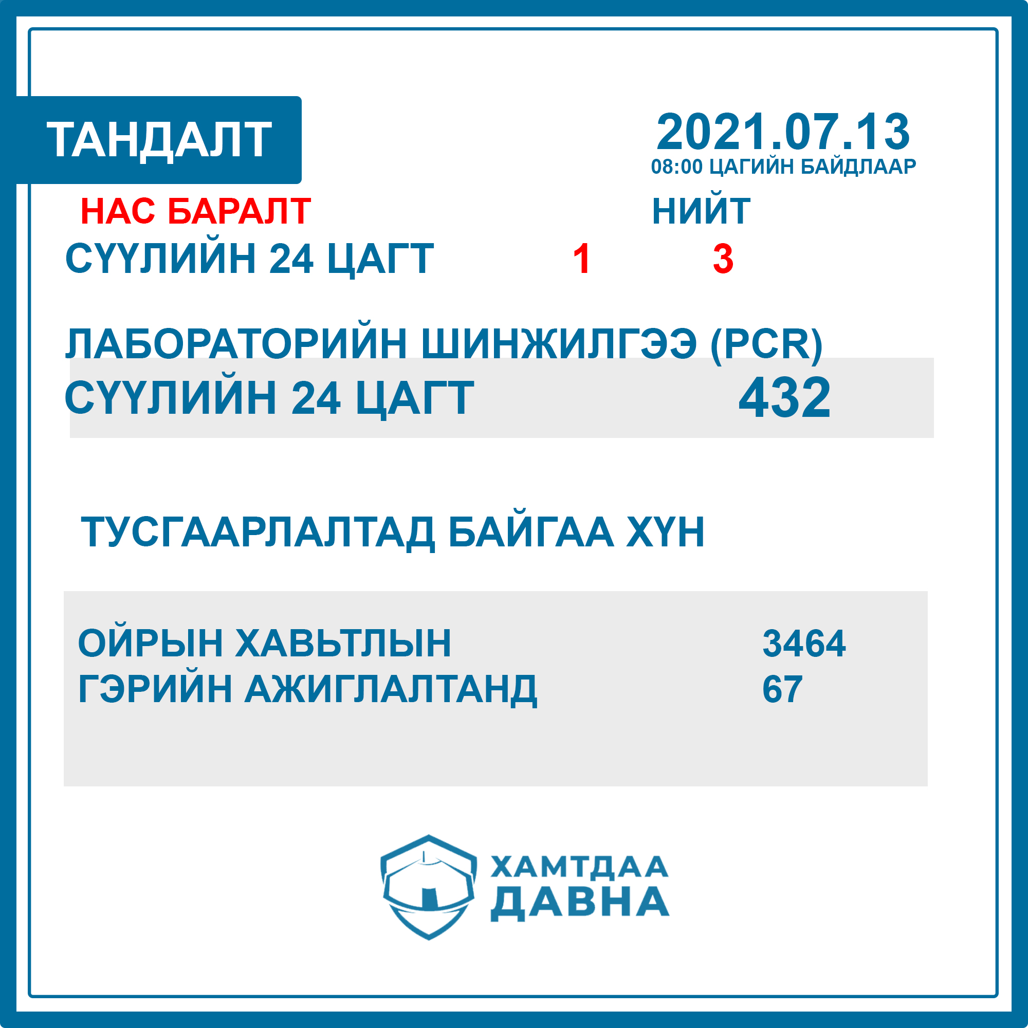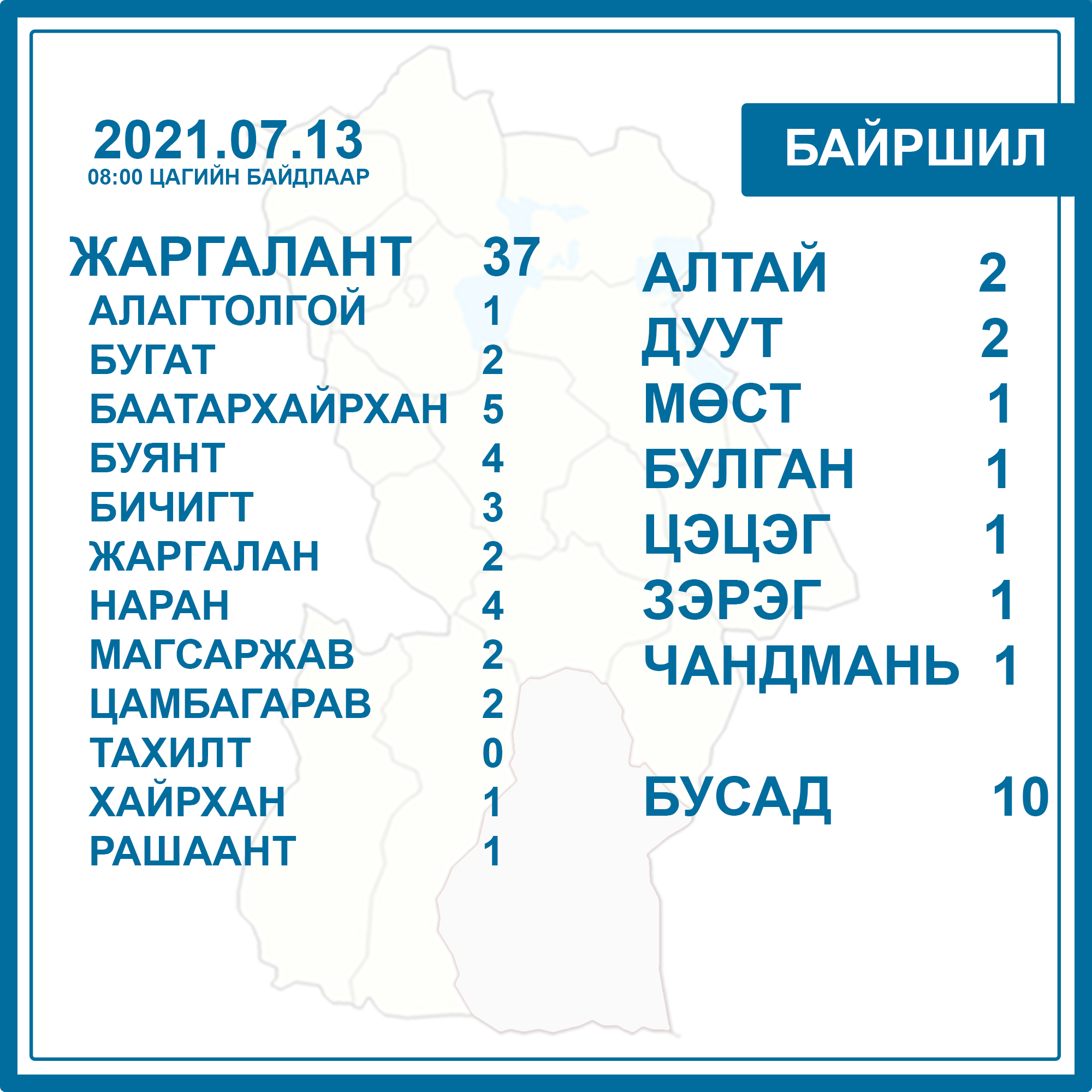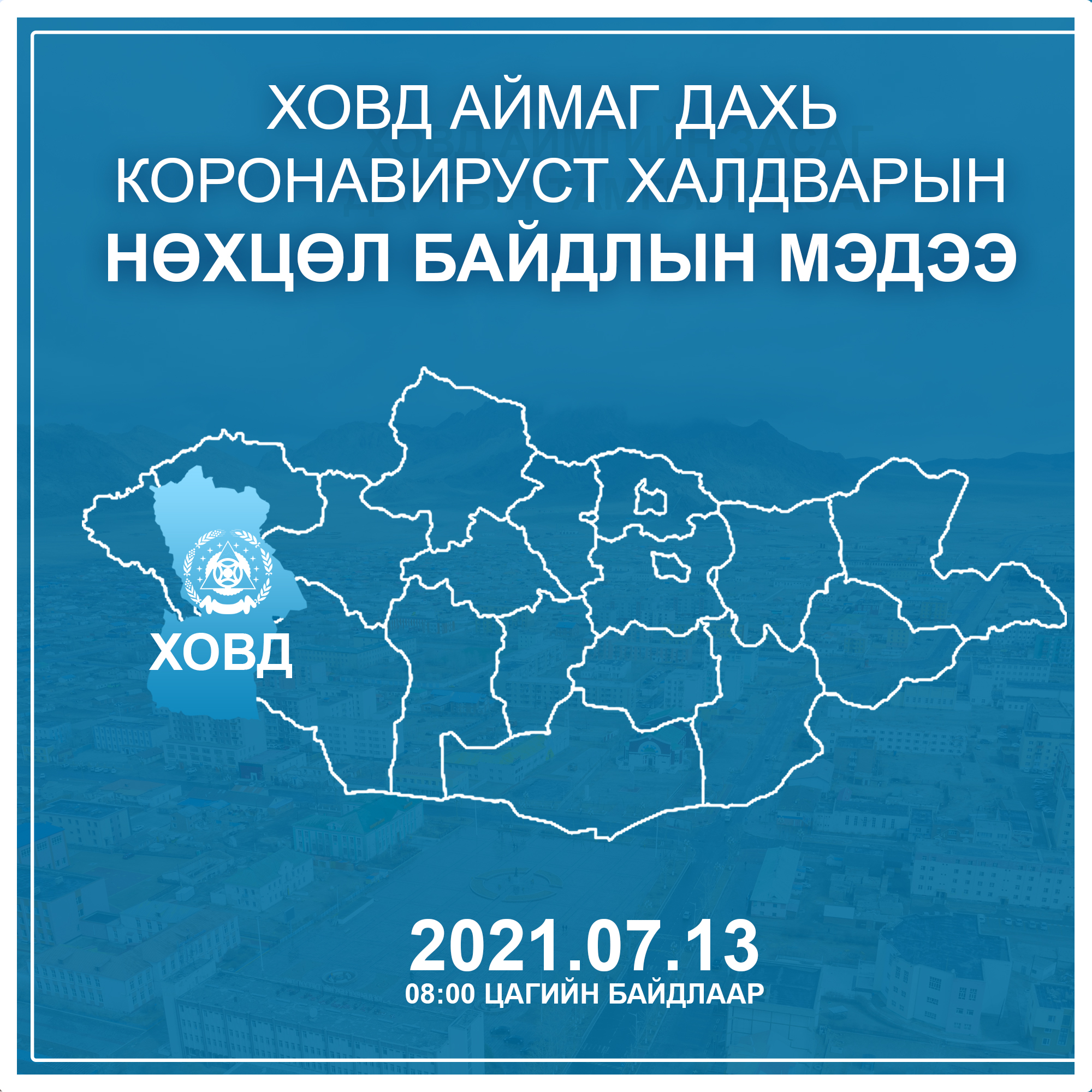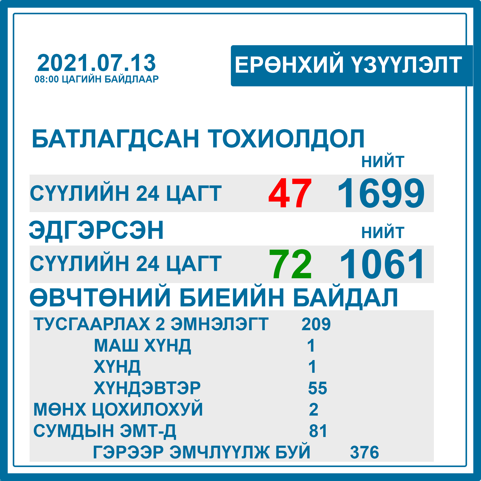 2021 оны 07 дугаар сарын 12-ний 8:00 цагаас 07 дугаар сарын 13-ны 08:00 цаг буюу сүүлийн 24 цагийн хугацаанд нийт 432 сорьцод PCR шинжилгээ хийжээ. Коронавируст халдварын батлагдсан тохиолдол 47-оор нэмэгдэж нийт 1699 боллоо.
