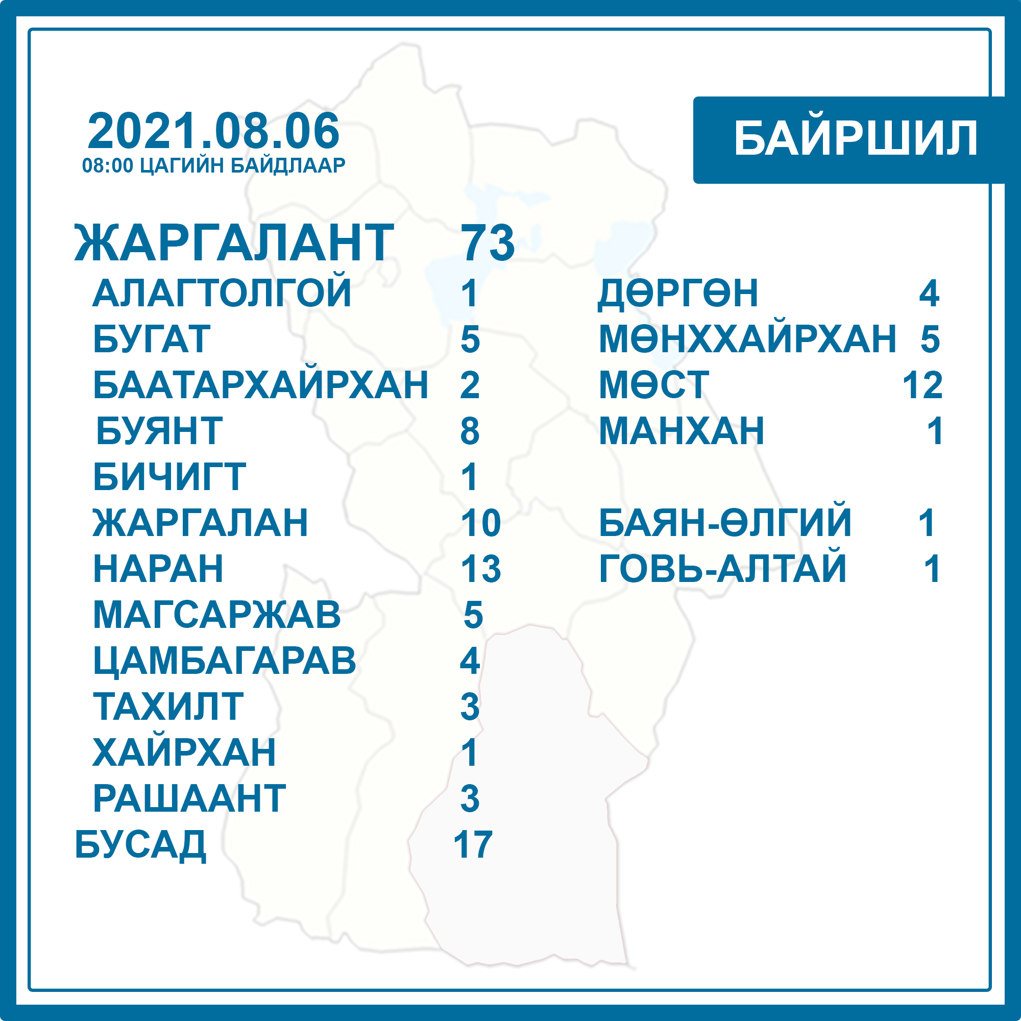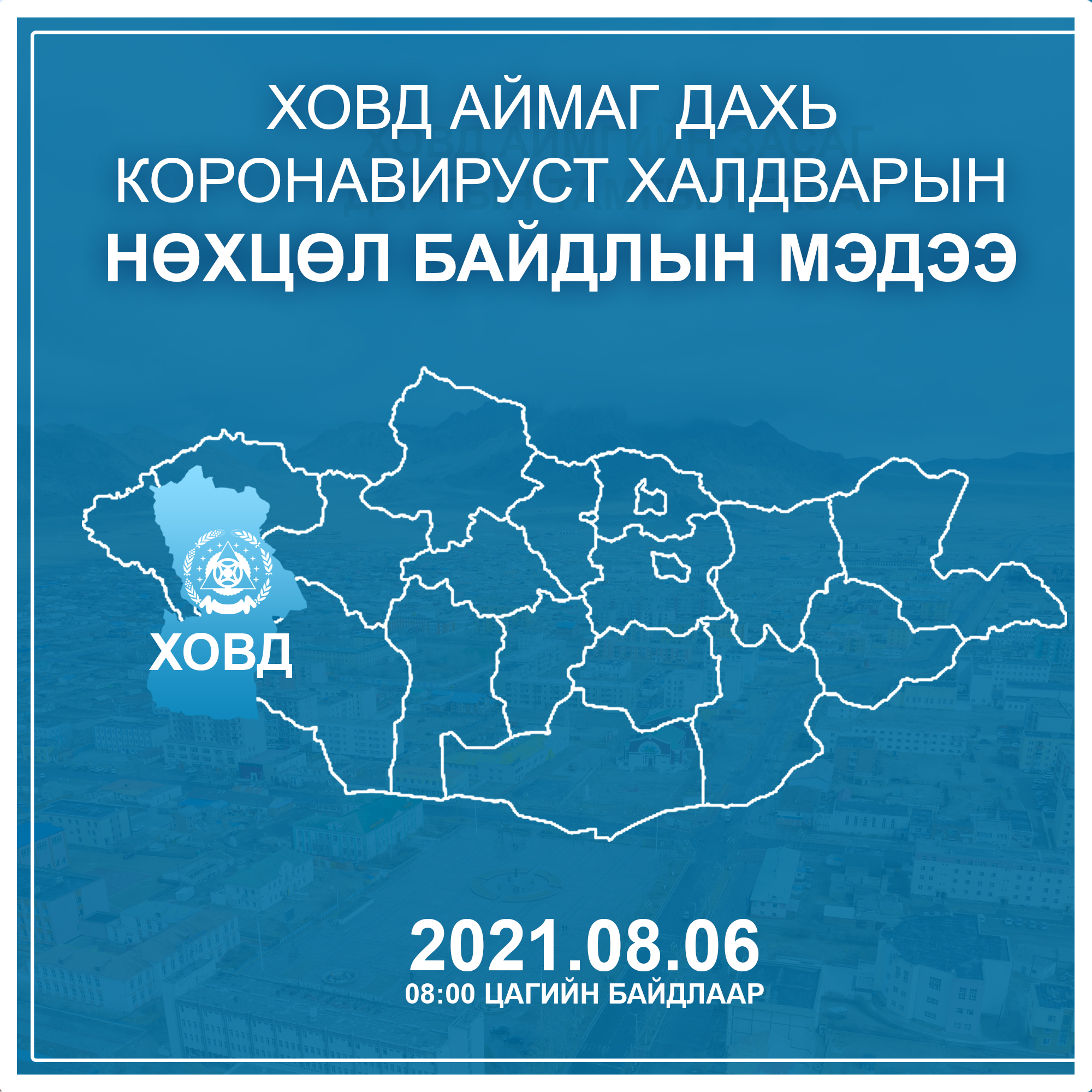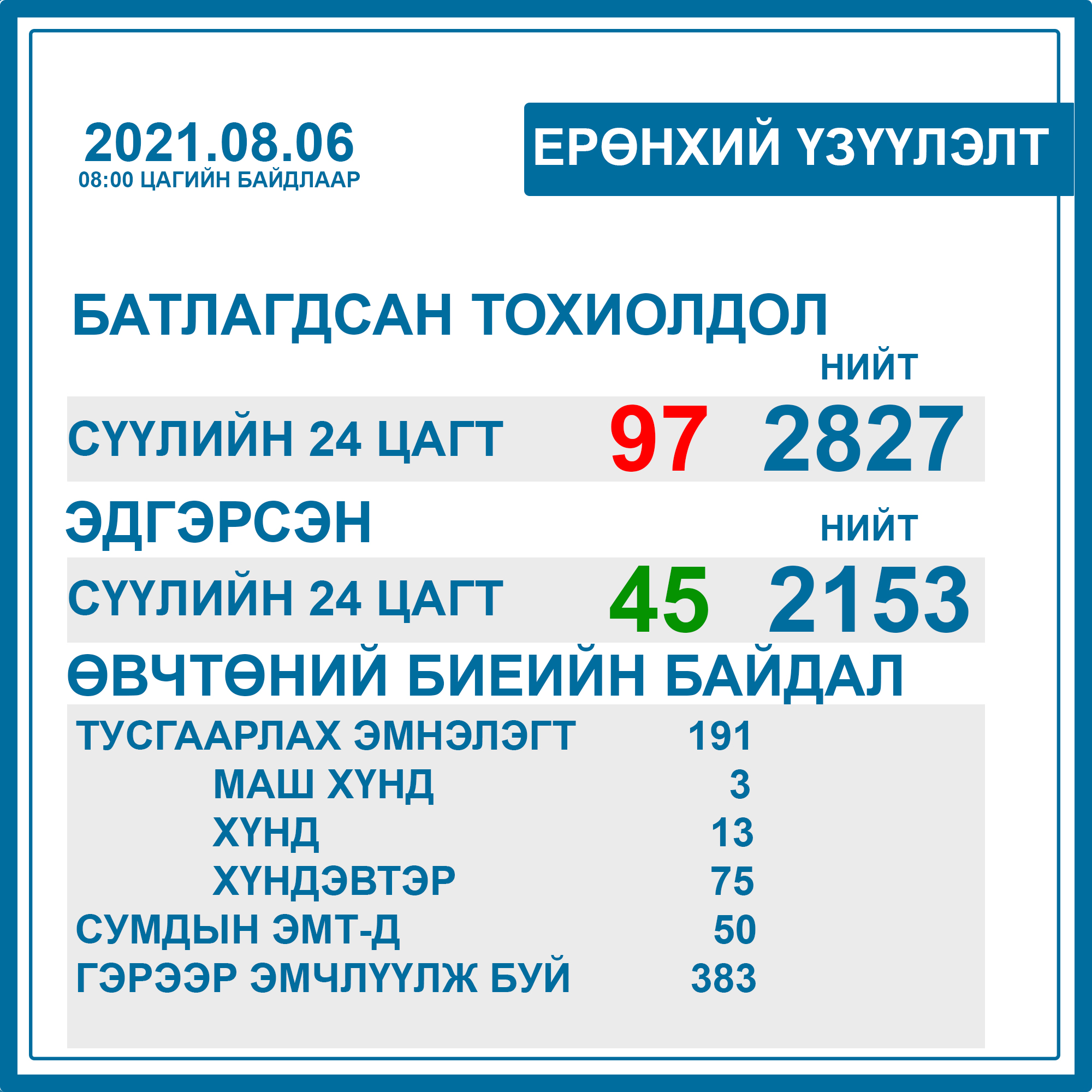 2021 оны 08 дугаар сарын 05-ны 8:00 цагаас 08 дугаар сарын 06-ны 08:00 цаг буюу сүүлийн 24 цагийн хугацаанд нийт 260 сорьцод PCR шинжилгээ хийжээ. Коронавируст халдварын батлагдсан тохиолдол 97-оор нэмэгдэж нийт 2827 боллоо.