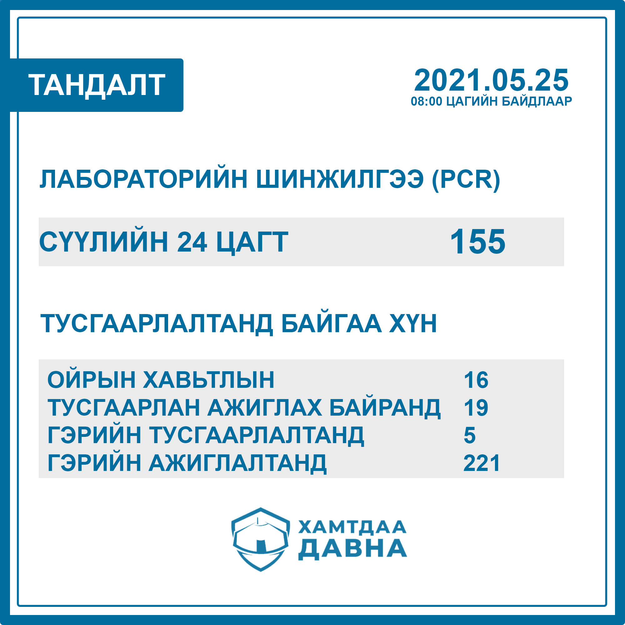 Бүсийн оношилгоо эмчилгээний төвийн Вируслогийн салбар лаборатори 2021 оны 05 дугаар сарын 24-ний 8:00 цагаас 05 дугаар сарын 25-ны 08:00 цаг буюу сүүлийн 24 цагийн хугацаанд нийт 155 сорьцод PCR шинжилгээ хийжээ. Бүгд сөрөг гарсан байна.