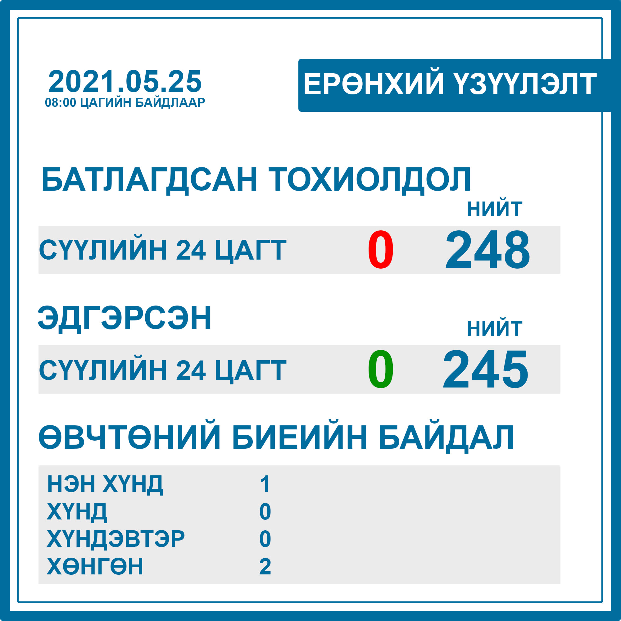 Өнөөдрийн /2021.05.25-ны 08:00 цаг/ байдлаар аймгийн хэмжээнд ойрын хавьтлын 16 иргэн, тусгаарлан ажиглах байранд 19 иргэн, гэрийн тусгаарлалтад 5, гэрийн ажиглалтад 221 иргэн байна.