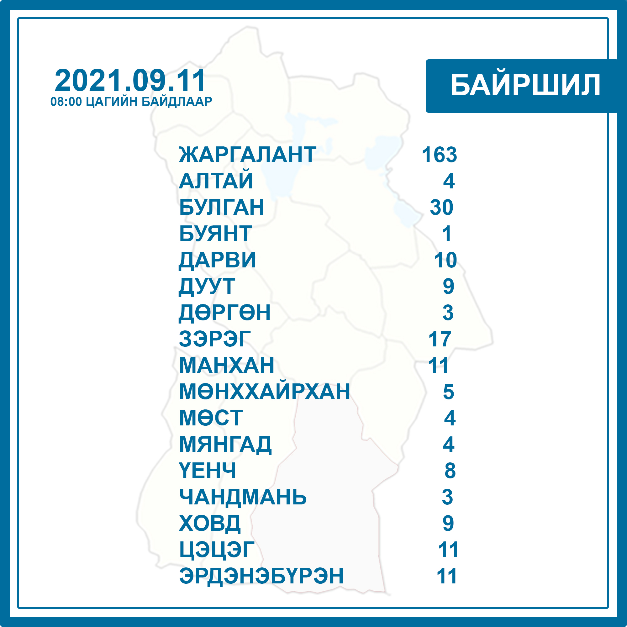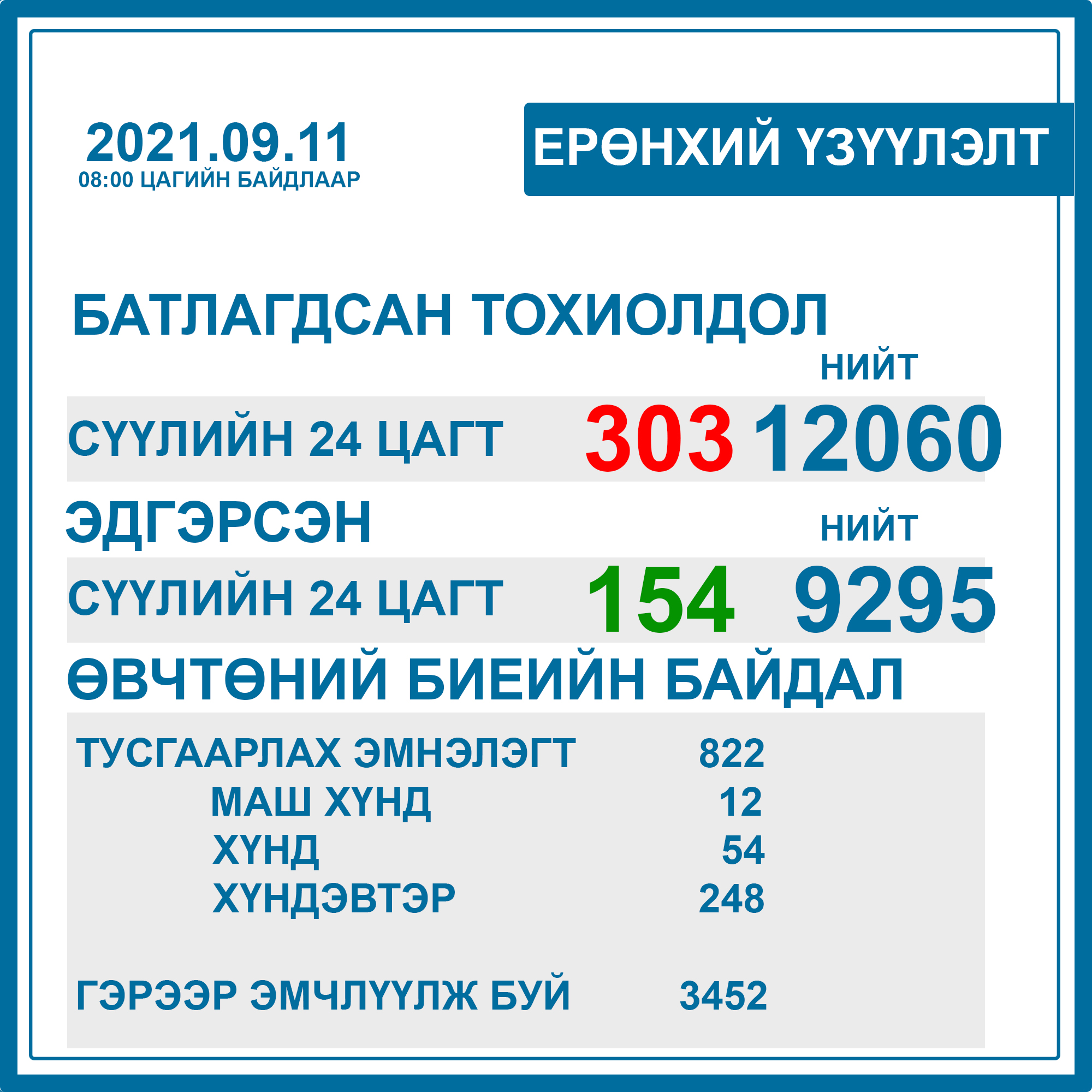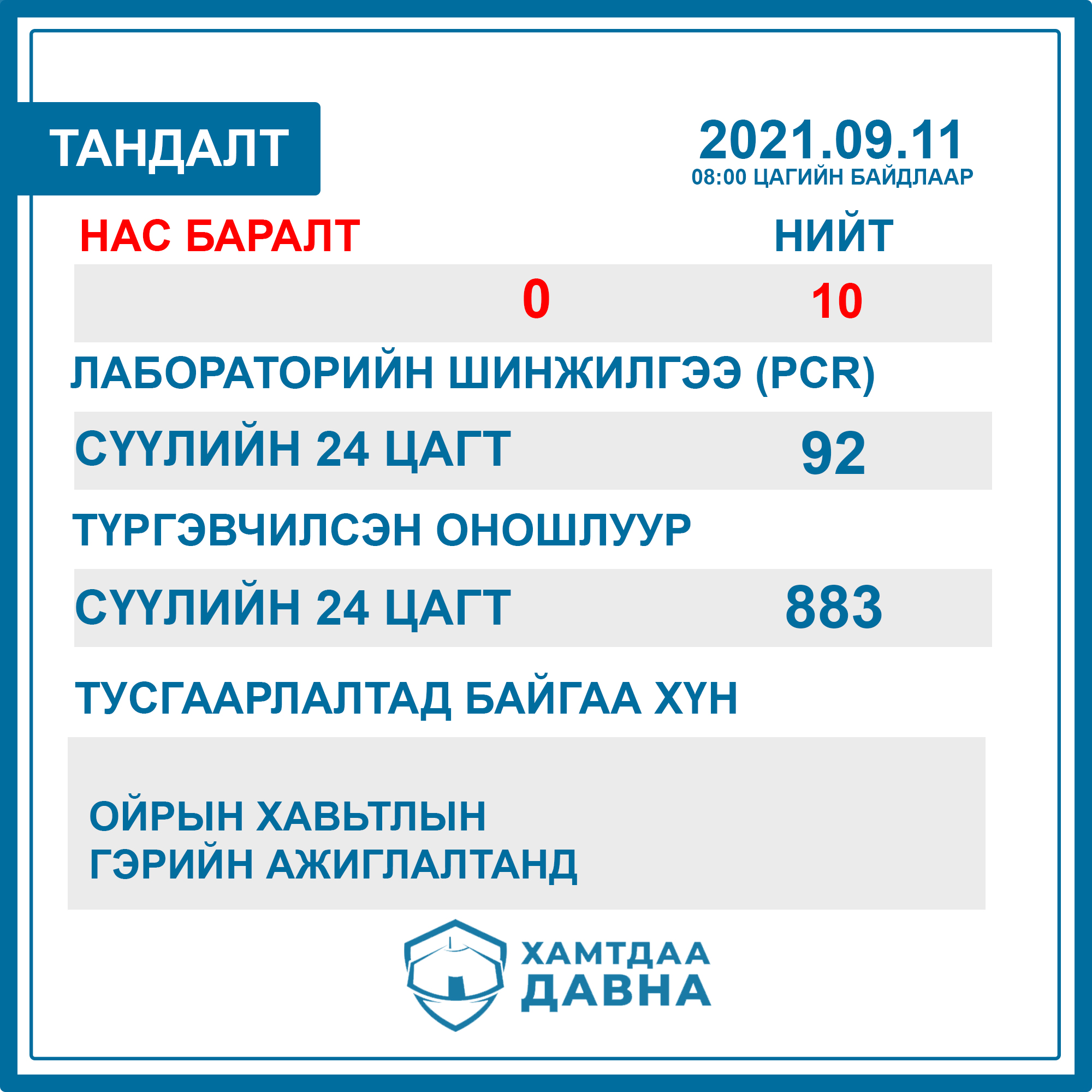 2021 оны 09 дугаар сарын 10-ны 08:00 цагаас 09 дүгээр сарын 11-ний 08:00 цаг буюу сүүлийн 24 цагийн хугацаанд нийт 883 сорьцод түргэвчилсэн оношлуураар шинжилгээ хийхэд 277 эерэг, 92 сорьцод PCR шинжилгээ хийхэд 26 эерэг гарчээ. Коронавируст халдварын батлагдсан тохиолдол 303-аар нэмэгдэж нийт 12060 боллоо.