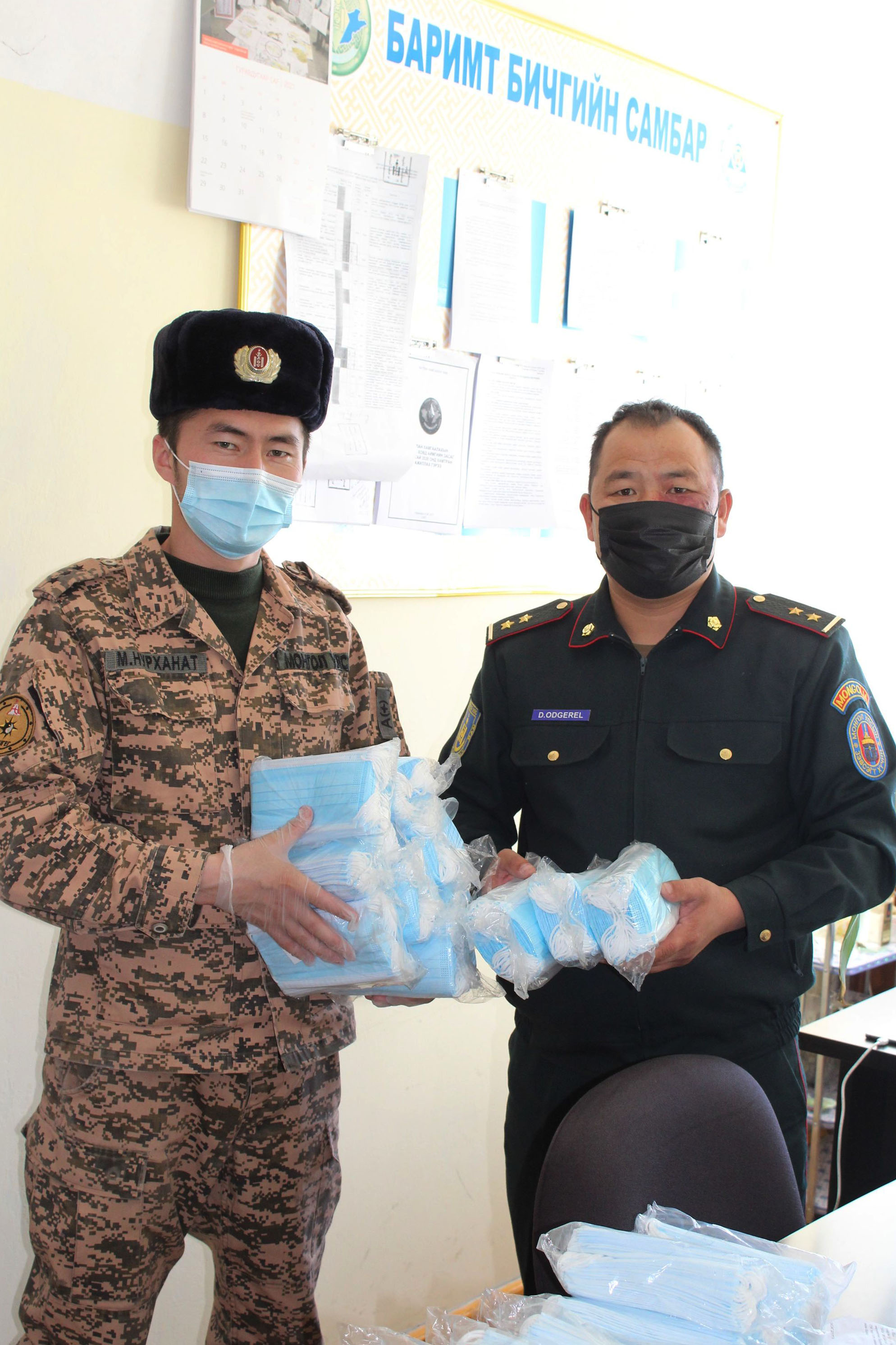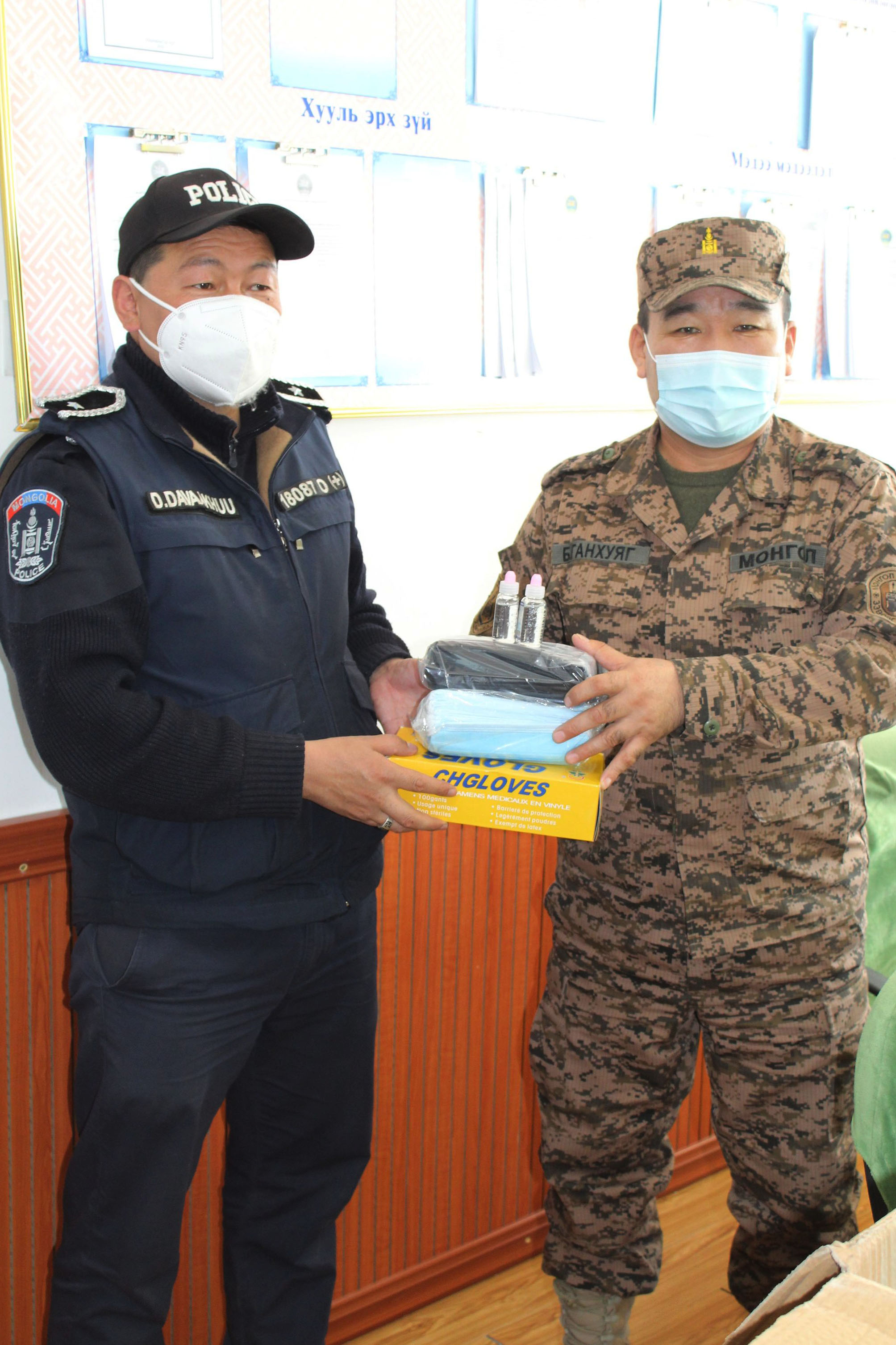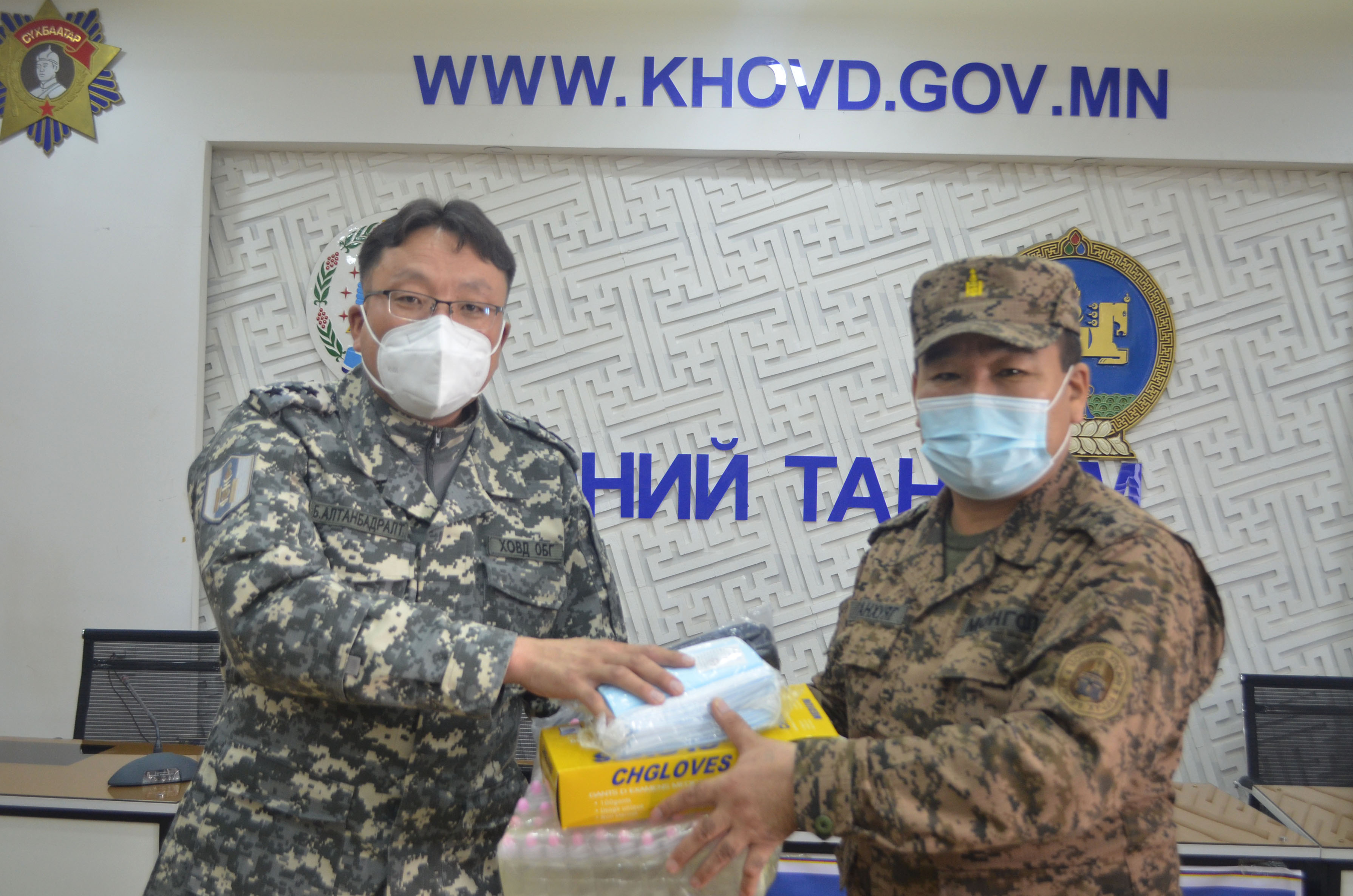 Тухайлбал, амны хаалт – 10000 ширхэг, бээлийн – 5 хайрцаг /250 ширхэг/, гар ариутгагч /санитол/ – 100 ширхэг ирүүлсэнийг аймгийн Засаг даргын Тамгын газрын Цэргийн штабын дарга хурандаа Б.Ганхуяг болон Цэргийн штабын алба хаагчид анги байгууллагын захирагч, дарга, удирдлагуудад хүлээлгэн өглөө.